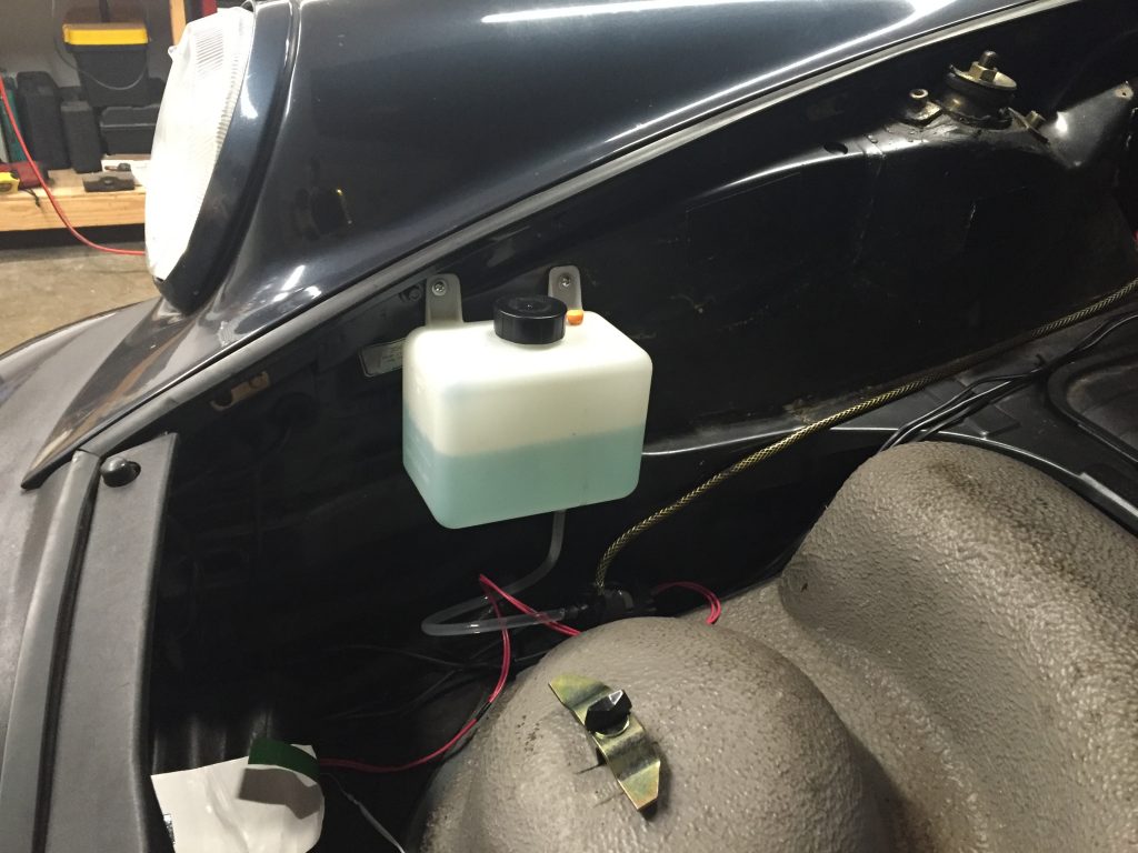 I purchased a generic washer bottle from Ebay and installed it on the passenger side of the front trunk. The pump and hoses were re-used but rerouted from the left side to the right. Also, the power for the pump required a long jumper.