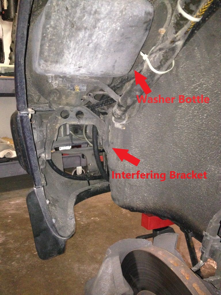 The stock windshield washer reservoir for my ’87 is located in the left front fender behind the headlight bucket. Although not that heavy itself, it is quite large and can hold a few gallons of water (heavy). As I was also working on adding a front fender condenser, I wanted the room.