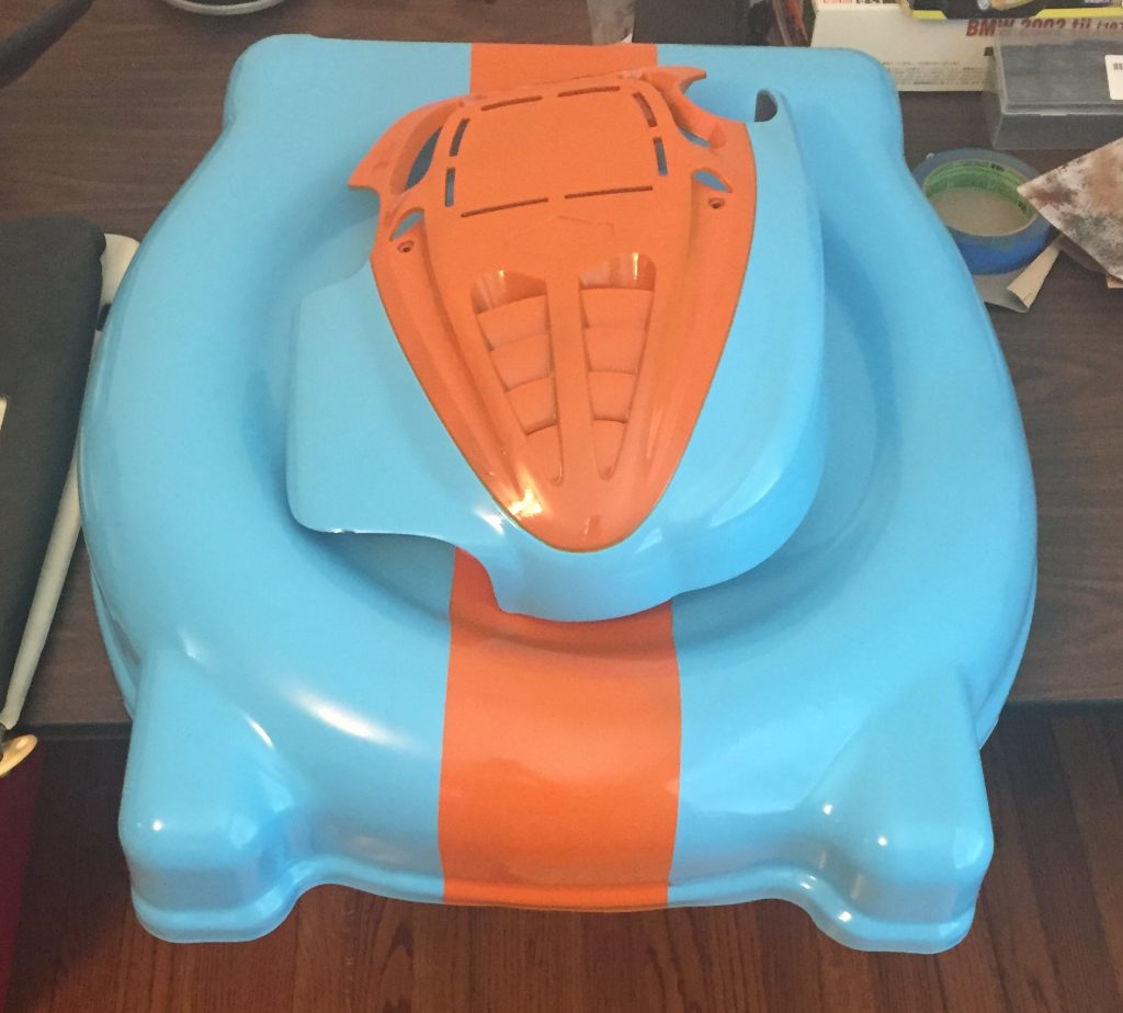 I purchased some powered wheelchair motors, some cheap Chinese motor controllers and an RC radio from Ebay and proceeded to weld up a frame and give it some racy paint!