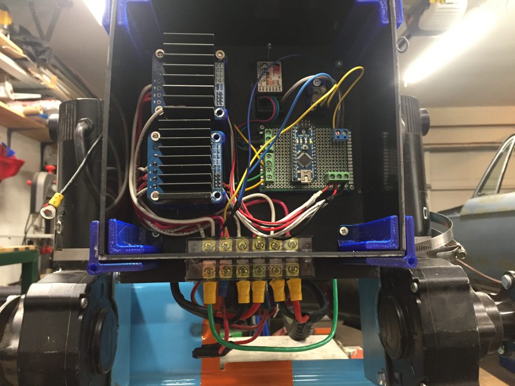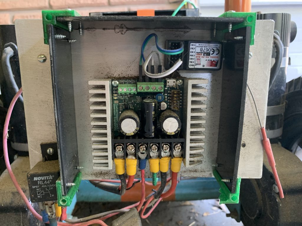 Eventually, we got it assembled but the cheap drivers just wouldn’t move the big mower properly. Either too slow, popping fuses or both. We tried a different brand but they are all the same. Finally, I broke down and spent the money for a proper Sabertooth dual channel motor driver. I highly recommend this route as it is a brilliant piece of kit; basically plug and play!