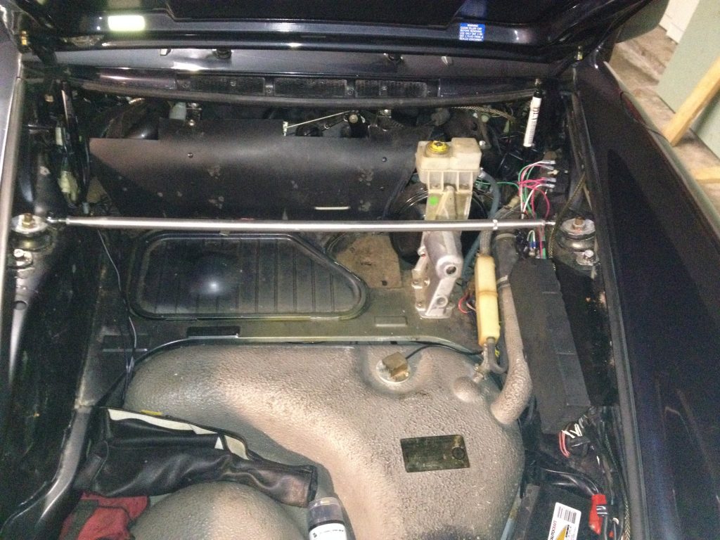 Strut braces are intended to reduce the flex of the front shock mounts under load and maintain a consistent amount of front camber. Although available from several vendors, it seemed like another easy DIY project.